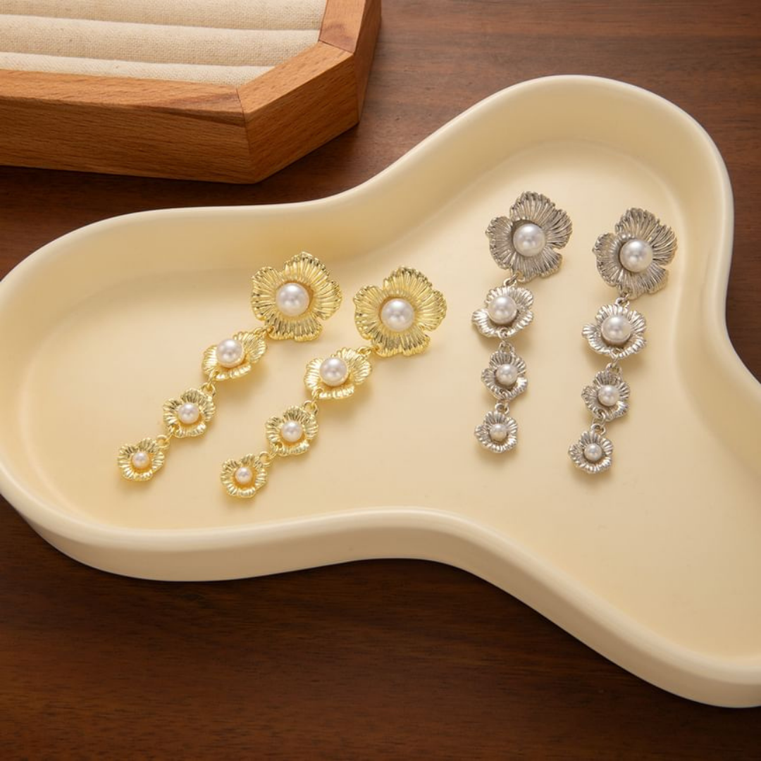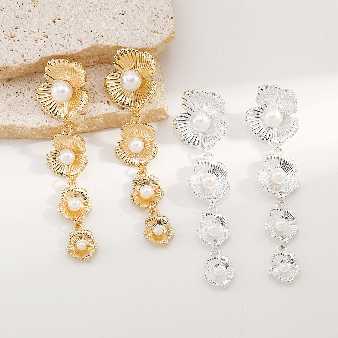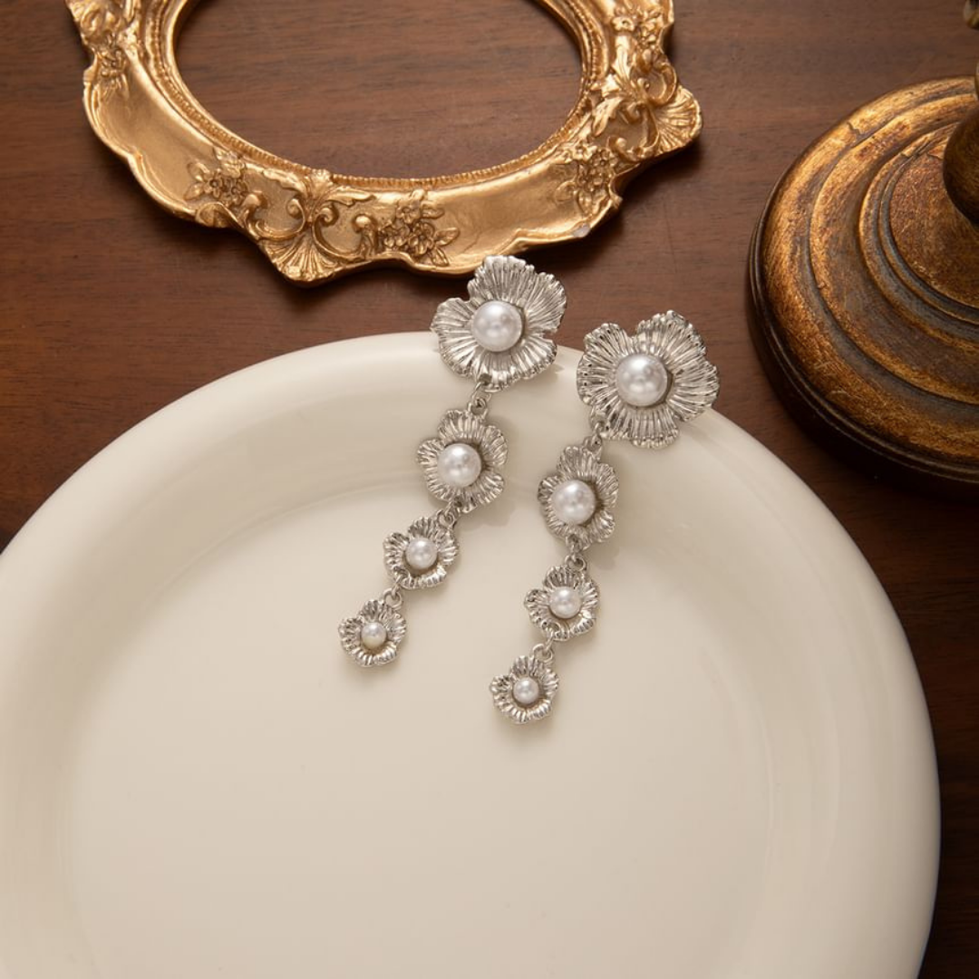 Floral Pearl Long Drop Earrings - Silver