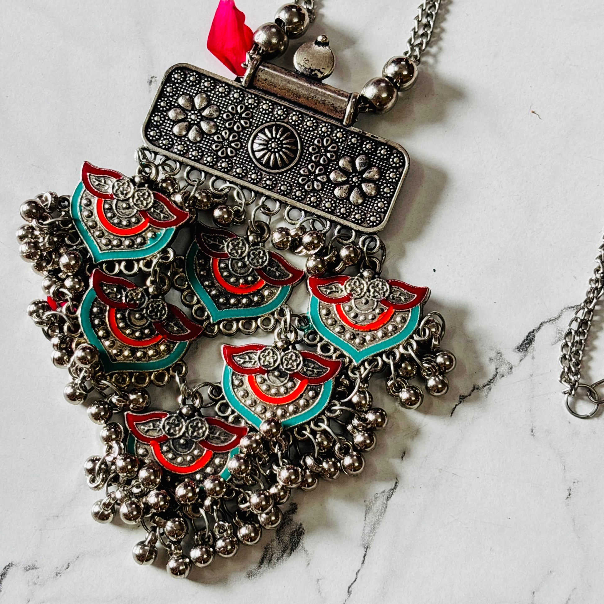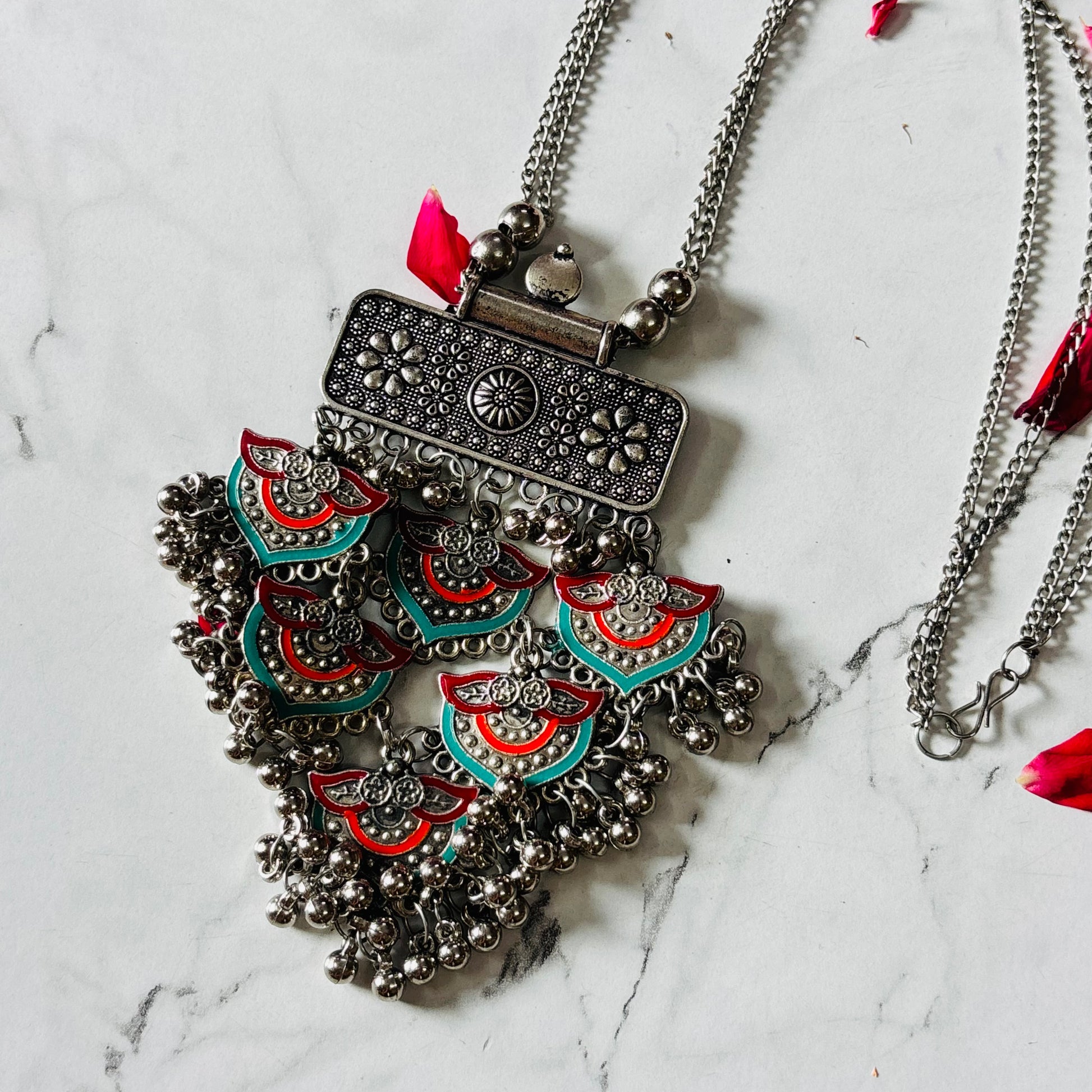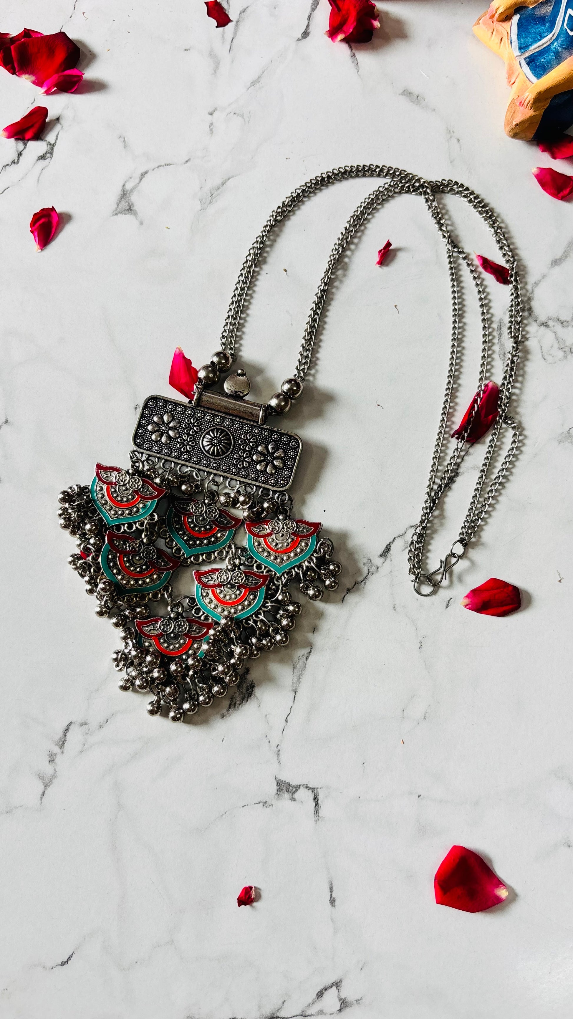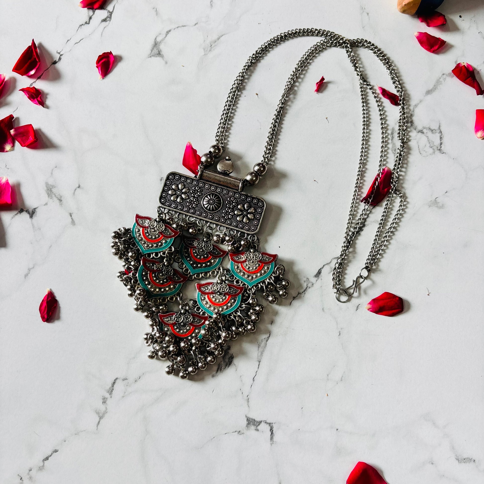 Oxidised Red Green Enamel Fan Pendant Long Chain Necklace
