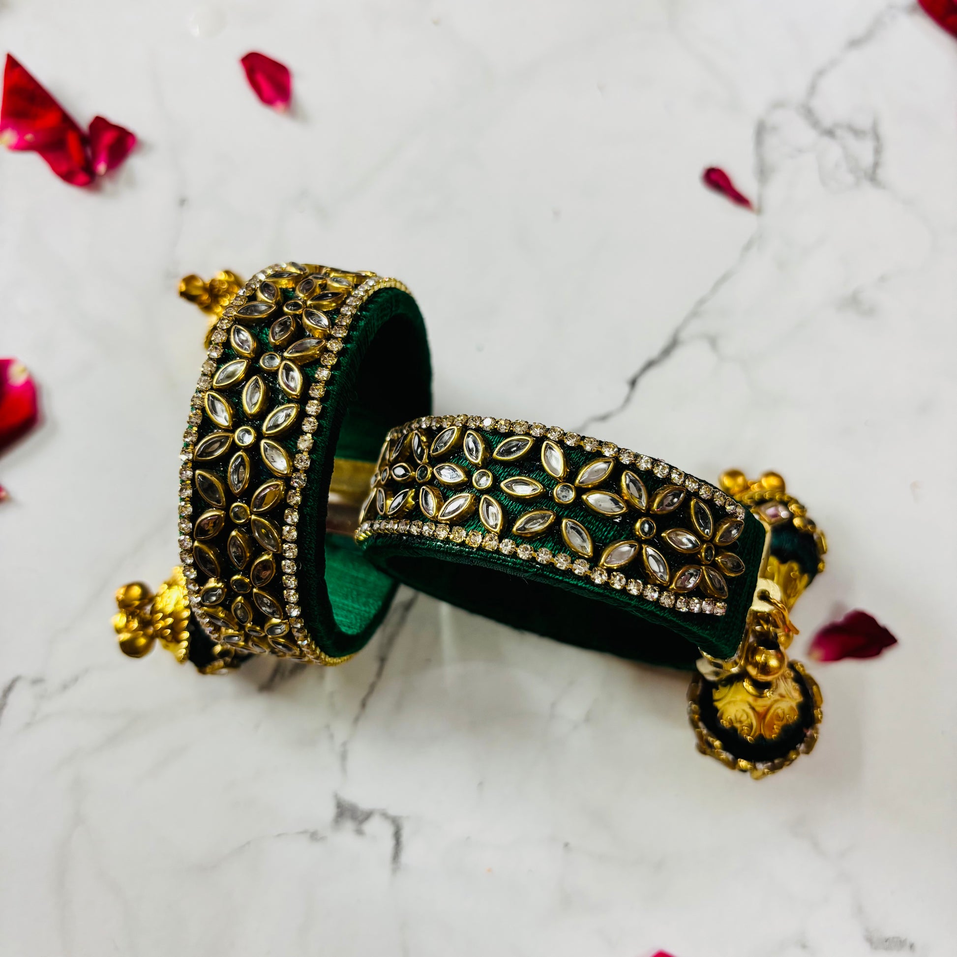 Elegant Kundan Bangles with Jhumka Charms. Handcrafted bangles with intricate Kundan stonework, teal silk base, and sparkling crystal borders. Finished with golden jhumka danglers, perfect for weddings, parties, and festive occasions.